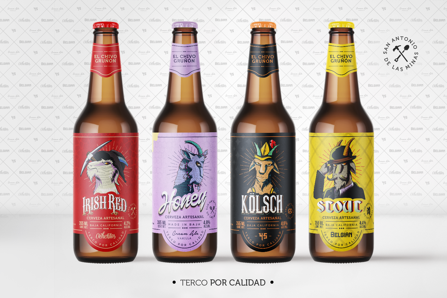 Como parte de este proyecto se trabajó en un diseño escalable y replicable. Se realizaron una serie de ilustraciones teniendo como figura principal "un chivo gruñón” para personificar y distinguir cada una de las variedades. Se diseñaron una tipografía a medida para los nombres de las variedades de cerveza, así como sus respectivos sellos distintivos.